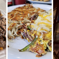 Cheese omelet with bacon, sausage, and ham. Loaded with mushrooms, onions, tomatoes & bell peppers.